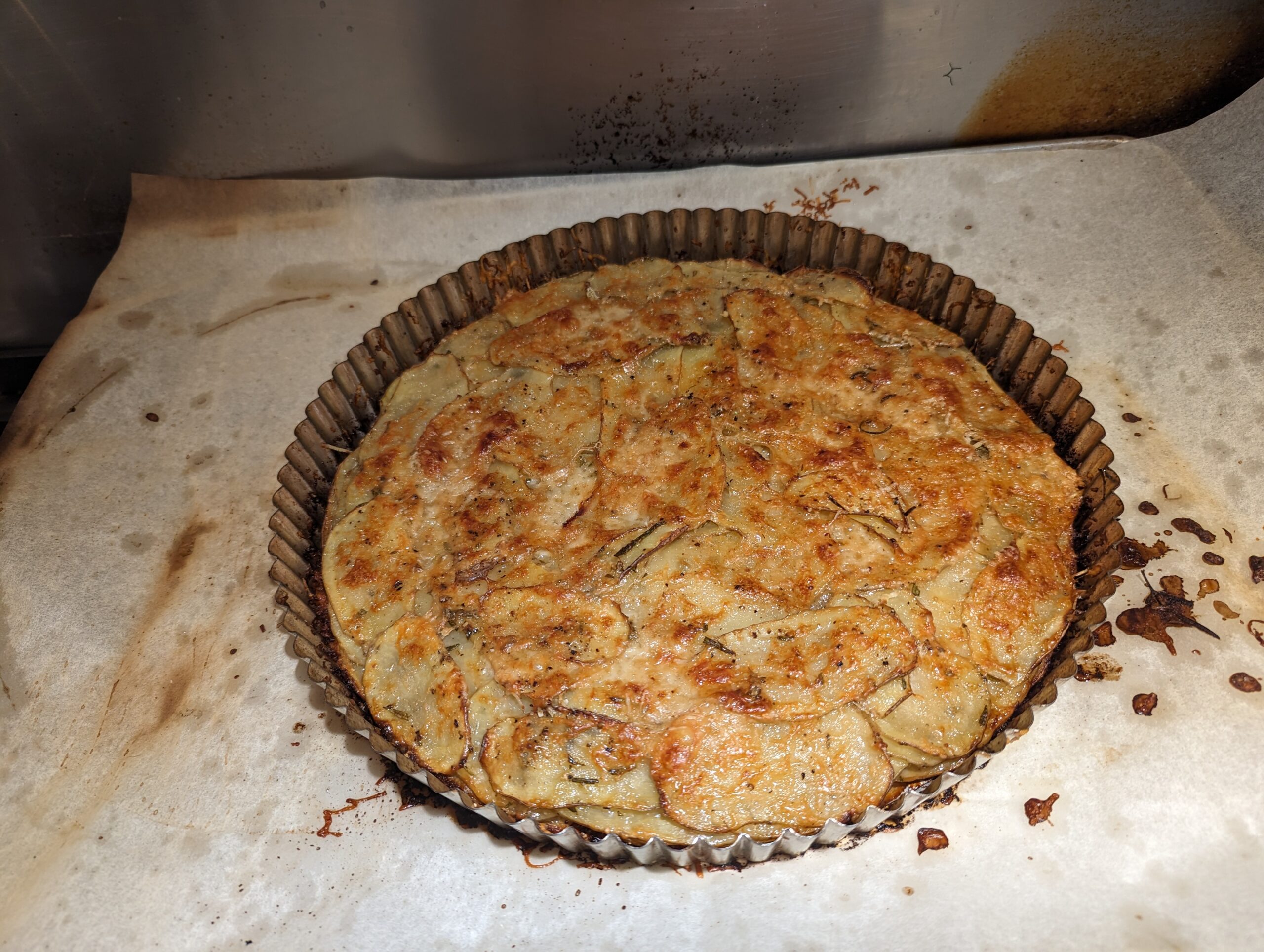 Bake the galette until the top is a reddish golden brown and the potatoes are tender in all places (a fork with thin tines should poke easily through all the layers), 45 to 50 min. The bottom will be crisp and the sides brown.