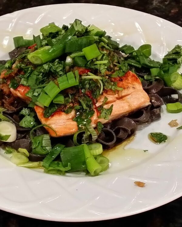 Ocean Trout (or Salmon) with Squid Ink Pasta and Soy-Chilli Dressing